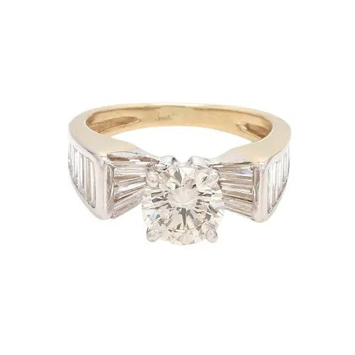 This elegant 1.50ct round brilliant diamond ring, set in 14K white gold, features a stunning center stone complemented by 1.20ctw of baguette diamonds. Size 5.25 and resizable, this ring weighs 4.3 grams and includes a GIA certificate (#1226024075)