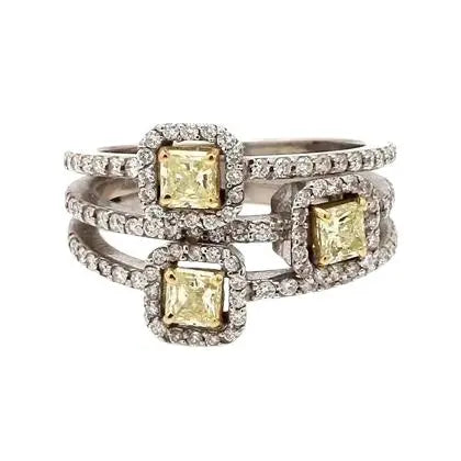 14k two-tone gold ring featuring 0.75 carats of fancy yellow radiant cut diamonds and 0.57 carats of round brilliant cut diamonds. Sized 7.25 and weighing 7.4 grams.