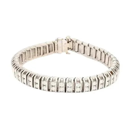 This 14k white gold tennis bracelet features 4.32ct of round brilliant cut diamonds. It measures 6.75" in length and weighs 40.4g.