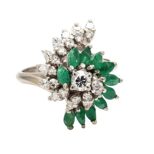 This stunning ring features a 0.15ct round brilliant cut diamond, beautifully complemented by 1.00ctw of emeralds and additional round brilliant and marquise diamonds (totaling 1.22ctw). Crafted in 14K white gold, it weighs 6.5g and is size 7 (resizable)