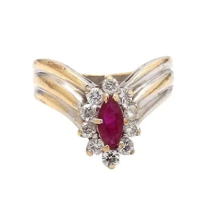 This stunning ring features a 0.25ct marquise ruby, beautifully complemented by 0.30ctw round brilliant cut diamonds. Crafted in 14K white gold, it weighs 4.5g and is size 6.25 (resizable)