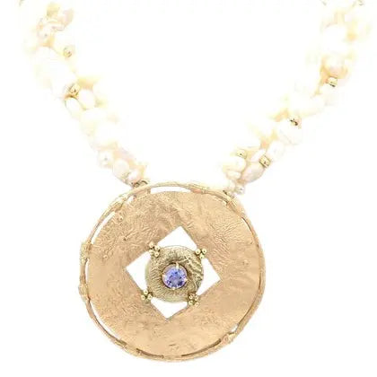 14K Yellow Gold 3-Strand Pearl Necklace with Round Tanzanite Pendant/Brooch by Ann Krupp