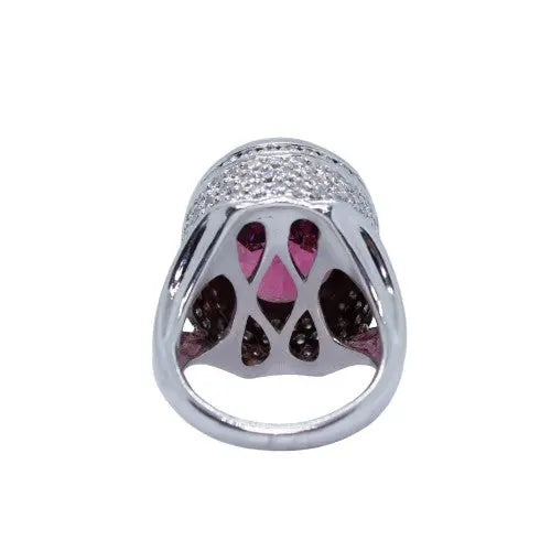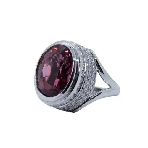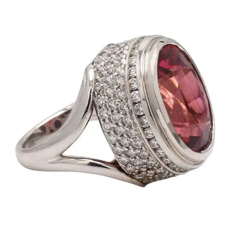 This ring features a 15.00-carat oval pink tourmaline set in 18K white gold. It is accented by 3.00 carats of round brilliant cut diamonds. Weighing 17.20 grams, this size 6.5 ring is resizable for the perfect fit.