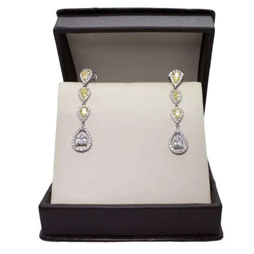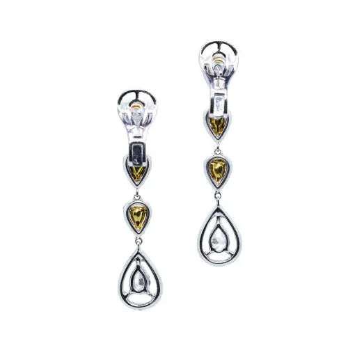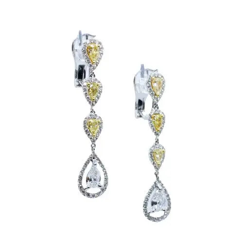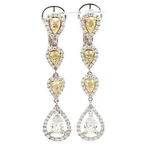 These elegant drop earrings showcase pear-shaped yellow diamonds set in 18K gold. Each yellow diamond is encircled by a halo of smaller white diamonds, adding to their radiance. The design is completed with round white diamonds, enhancing the overall brilliance. Total weight: 7.7g.