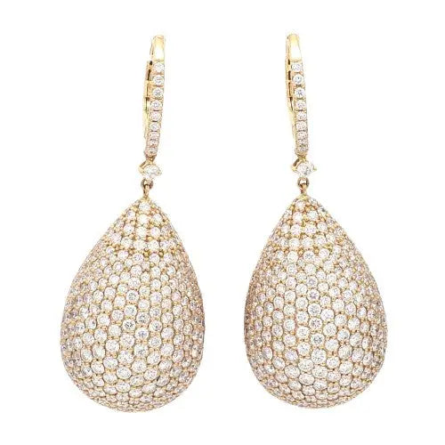 These stunning 18K rose gold pave drop earrings feature 938 round brilliant cut diamonds, totaling 14.96 carats. Weighing 18.3 grams, they are a dazzling and elegant addition to any jewelry collection.