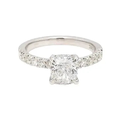 18k white gold ring featuring a 1.51ct E SI2 round brilliant cut GIA-certified diamond (GIA #2235103358), accented with 0.34ct and 0.15ct of round brilliant cut diamonds. Sized 6 and weighing 3.7 grams.