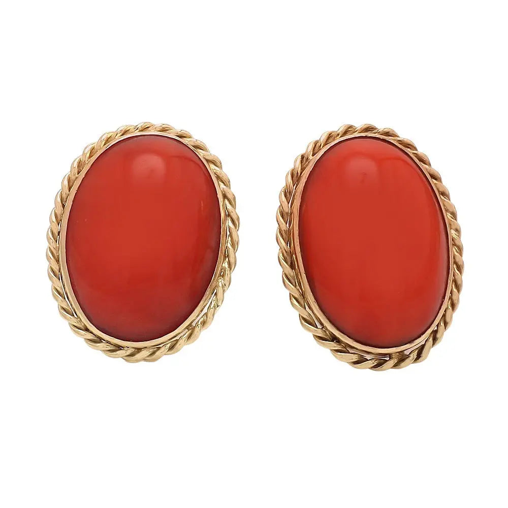 These beautiful 18K yellow gold earrings feature oval-cut coral stones set in twisted wire bezels, offering a unique and vibrant design. Weighing 7.2 grams, they add a bold, natural touch to any jewelry collection.