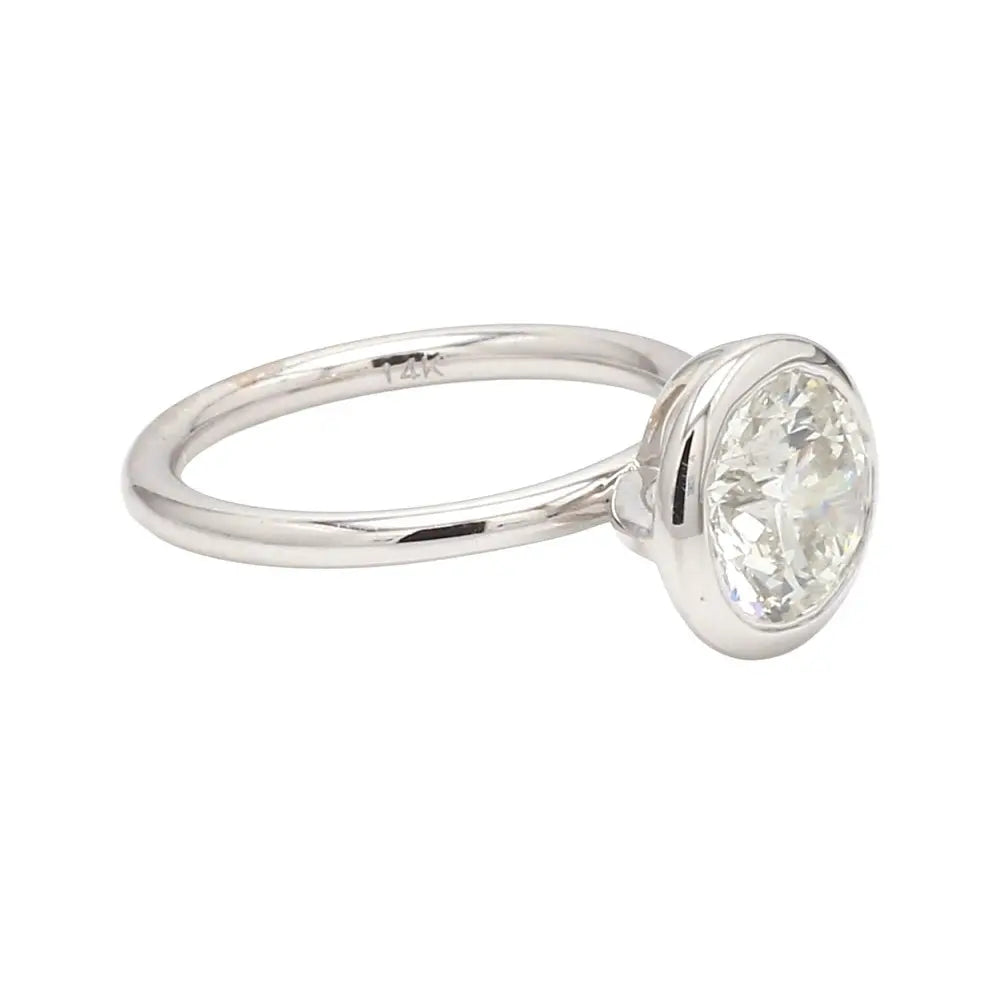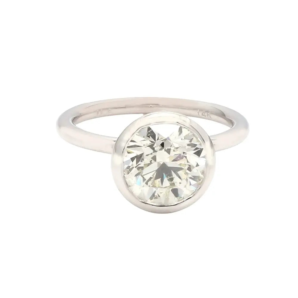 This timeless 2.16 carat round brilliant cut diamond KSI3 is crafted in a solitaire bezel setting in 14 karat white gold.