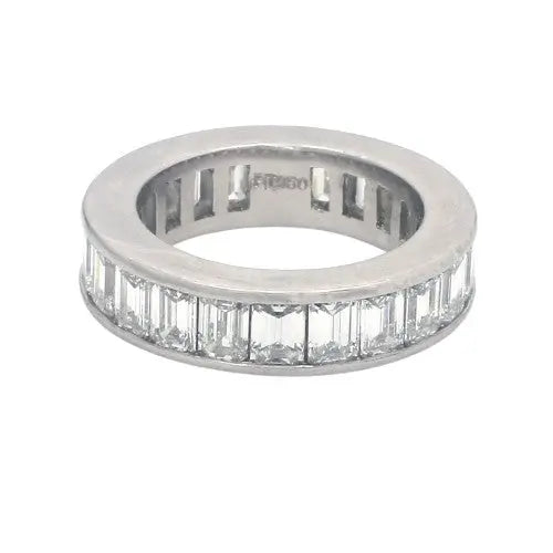 This exquisite estate eternity band features 22 emerald cut diamonds totaling 4.50 carats, set in luxurious PT950 platinum. Weighing 11.50 grams, it is size 5 and resizable for a perfect fit.