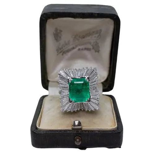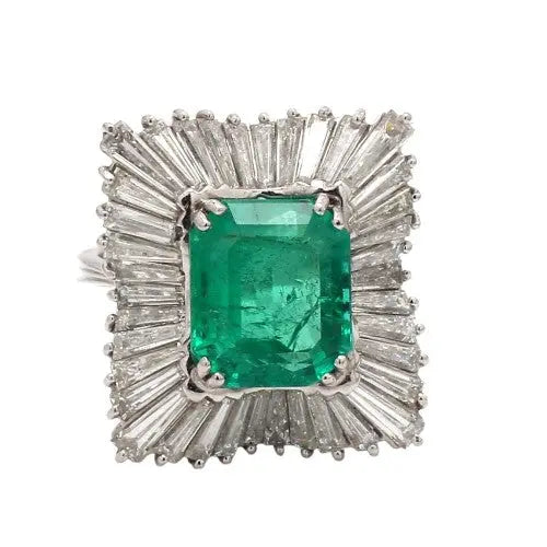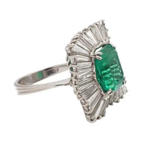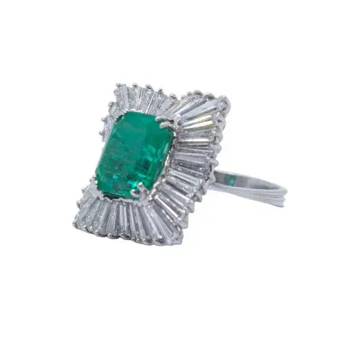 Gorgeous vintage estate piece featuring a 4.85ct Colombian Emerald surrounded by a wave of 38 tapered baguette diamonds totaling 4.00ctw set in platinum weighing 10.7 gram. The ring is certified by AGL and is size 6 (resizable).
