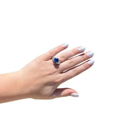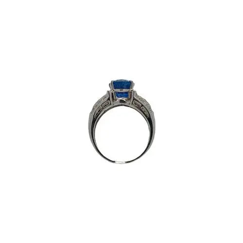 This stunning 5.08 carat Oval Blue Sapphire rests in a 14k white gold basket setting with 1.00ctw princess cut diamonds 32 round brilliant side stones. This estate piece weighs approximately 6.6 grams and is sized to a 7.