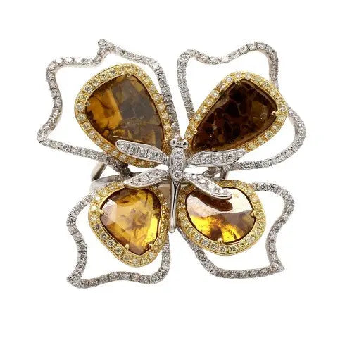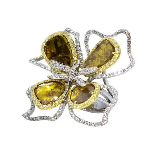 This unique fashion piece features 4 different Yellow Diamond Rose Cut Slices totaling 5.39ctw surrounded by 18 karat yellow gold halos with round brilliant cut diamonds and an additional organically shaped 18 karat white gold halo with round brilliant cut diamonds displaying a floral design. The center of the ring features a 18 karat white gold dragonfly set with 21 round brilliant cut diamonds all totaling to 214 stones. This piece weighs approximately 16.75 grams and is sized at a 6.5.