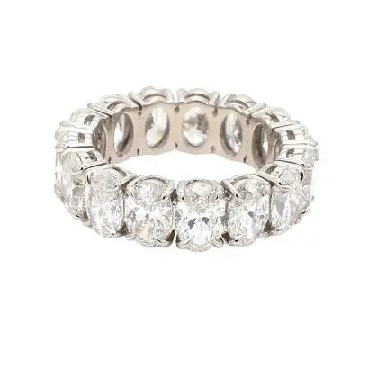 This stunning 7.75ctw oval diamond eternity band, set in PT 950 platinum, features 15 F-color, VS2-clarity diamonds. Resizable and weighing 8.2 grams, this size 6.5 ring offers unmatched elegance and brilliance.