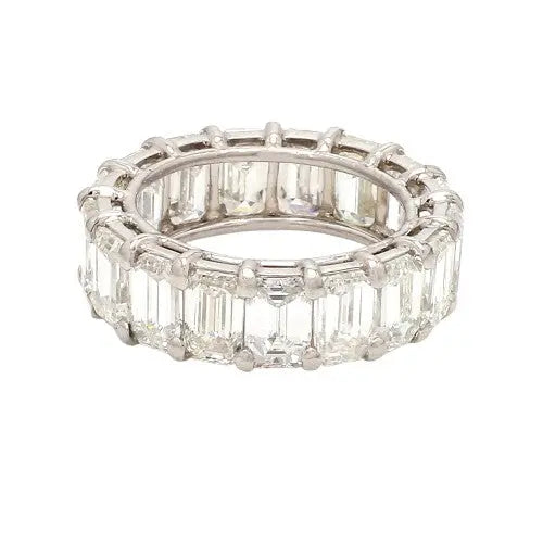 This elegant 8.78ctw emerald-cut diamond eternity band is set in platinum (PT 950), featuring 17 stunning diamonds. Resizable and weighing 7.00 grams, this size 5 ring epitomizes timeless sophistication.