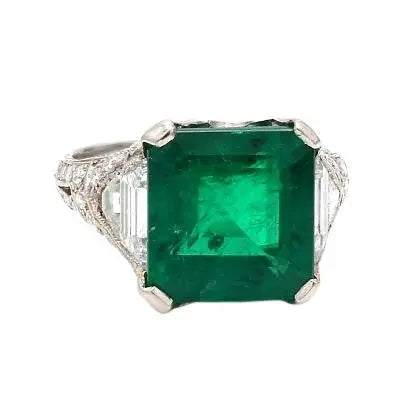 This exquisite platinum ring features a captivating square-cut green emerald. Accented by white diamonds, this piece is a striking addition to any collection.