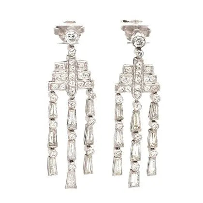 These exquisite platinum drop earrings feature 1.75 carats of white tapered baguette cut diamonds and 1.05 carats of white old European cut diamonds. Weighing 11.3 grams, they are a sophisticated addition to any jewelry collection.