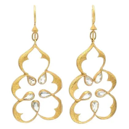 Elegant earrings by Cathy Waterman, featuring vibrant pear-shaped blue topaz gemstones. Crafted in 22k yellow gold, this 10.6g pair exemplifies refined craftsmanship and timeless sophistication.