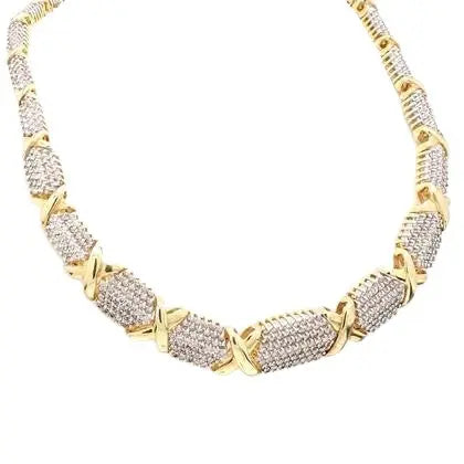 This striking necklace features a series of round-cut white diamonds, intricately set to form a captivating and luxurious design. The diamonds are interspersed with elegant gold accents, creating a harmonious blend of sparkle and shine. Crafted from a combination of 14k yellow and white gold, the necklace radiates opulence and sophistication.