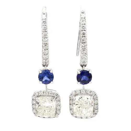 These earrings feature a 2.01 ct cushion-cut diamond at the center, flanked by vibrant 0.55 ct round sapphires and sparkling 0.56 ct round brilliant diamonds. Crafted in 18K white gold, they offer a perfect blend of elegance and sophistication. Total weight: 2.5g.