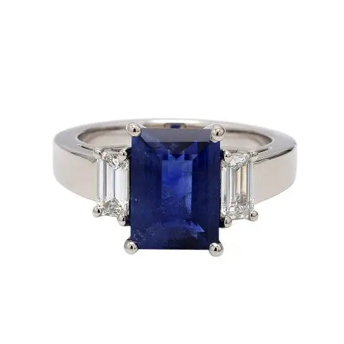 This platinum estate ring features a 3.65-carat emerald cut sapphire, complemented by 0.70 carats of emerald cut diamonds. Weighing 11.1 grams, it is size 6.5 and resizable.