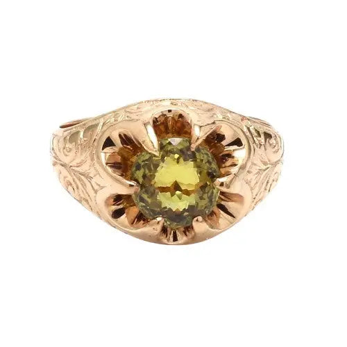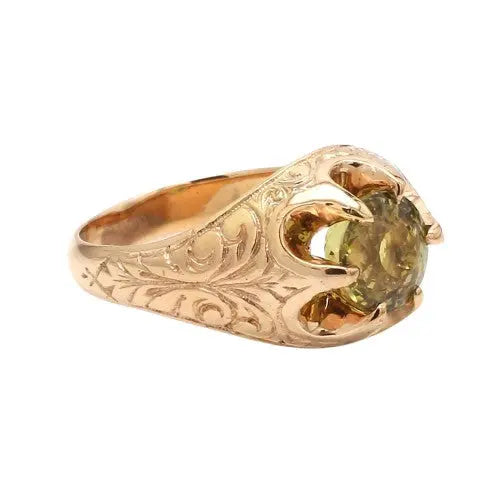 Estate 14K Round Peridot Belcher Style Ring with Ornate Engravings