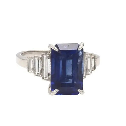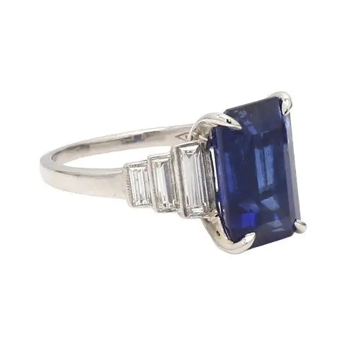 Estate Blue Sapphire & Diamond Platinum Ring showcases a 6.06ctw emerald-cut blue sapphire and 0.35ctw of baguette diamonds. Crafted in platinum with a ring size of 6.25 and weighing 5.50g.