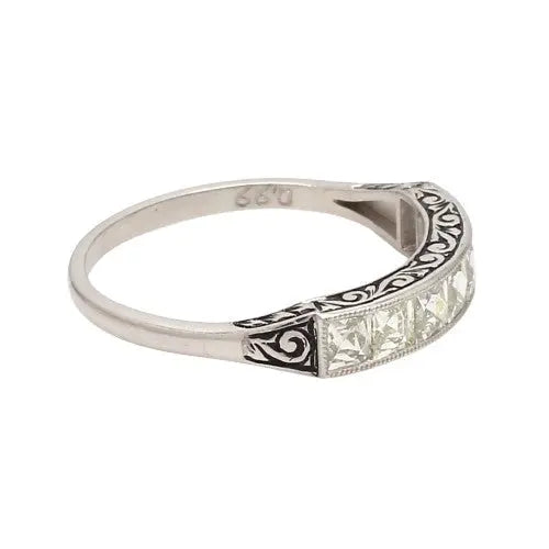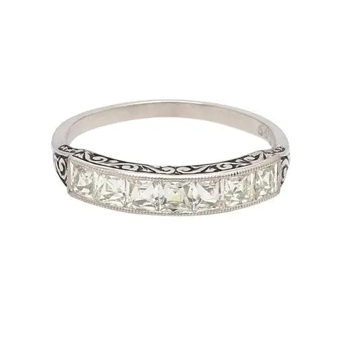 This elegant platinum ring features a row of French cut diamonds, each exhibiting a white hue and VS1 clarity. The diamonds are expertly set in platinum, offering a refined and sophisticated appearance. Weighing 3.1 grams, this piece is lightweight yet striking, ideal for any jewelry collection.