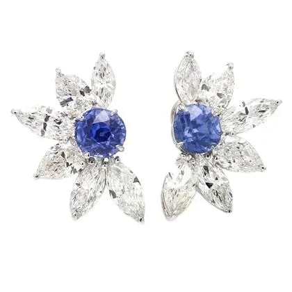 These stunning earrings showcase round-cut blue sapphires, elegantly surrounded by marquise-cut diamonds, all set in platinum. Total weight: 10.1g.