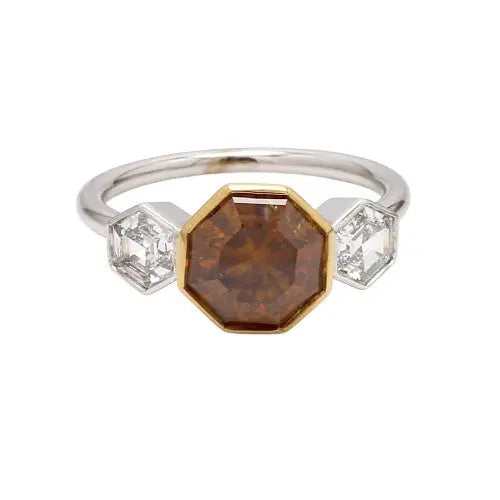 This exquisite ring showcases a captivating octagon-cut brown diamond, complemented by two hexagon-cut white diamonds. The warm brown hue of the central stone is beautifully offset by the brilliance of the white diamonds. Crafted in 18K gold, this piece is a refined addition to any jewelry collection.
