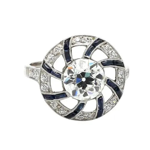 Platinum Ring with Old European Cut Diamond and Blue Sapphires