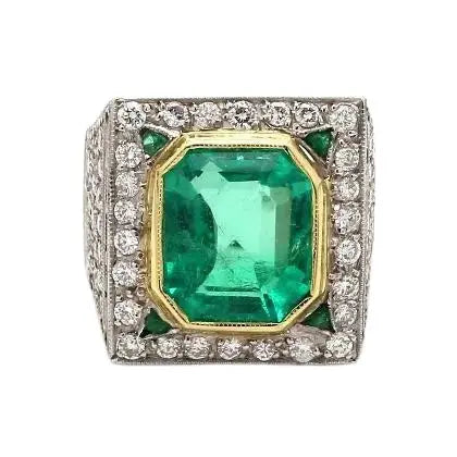 This platinum and 18k yellow gold ring features a 3.15ct emerald cut emerald with emerald accents, accented by 1.00ct of round brilliant cut diamonds. Weighing 10.7g and sized