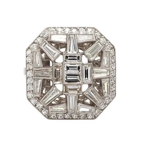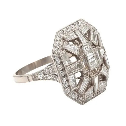 This platinum estate ring features 2.00 carats of tapered baguette diamonds, accented by 0.70 carats of old mine cut diamonds. Weighing 7.5 grams, it is size 7 and resizable.