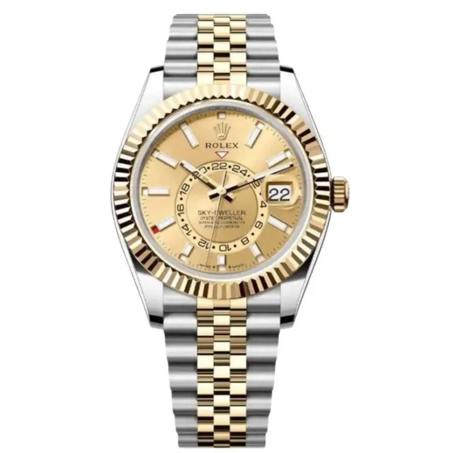 Rolex Sky-Dweller 42mm watch featuring a champagne dial and fluted bezel. Crafted with a stainless steel case and 18k yellow gold and stainless steel bracelet. Includes box and papers. Model 336933.