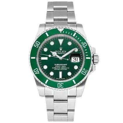 Rolex Submariner Hulk 40mm watch featuring a green dial and green bezel. Crafted in stainless steel. Model 116610.