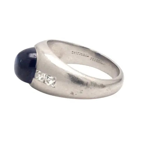 This Shreve & Co. ring features double cabochon unheated sapphires set in platinum, complemented by 0.50ctw of French cut diamonds. Size 7.25 and weighing 10.50 grams, it includes a GIA certificate (#5212584309).