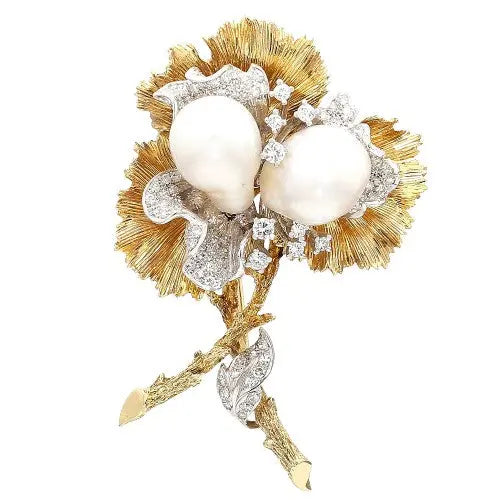 This exquisite brooch features a harmonious blend of white pearls and round cut diamonds, each diamond exhibiting a pristine white hue. The pearls are elegantly nestled among the diamonds, creating a striking contrast. Crafted in 14k gold, this piece exudes sophistication and artistry. Weighing 45.7 grams, it is a substantial addition to any collection.